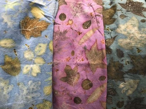Eco-Printing on Cellulose Fiber - Oct 11, 10am - 5pm (in studio) Eco-printing is a contact printing technique. Leaves are placed over mordanted fiber and rolled tight in a bundle. Next boiling or steaming the bundle transfers the tannins from within the leaves to the fiber. Beginner experience.